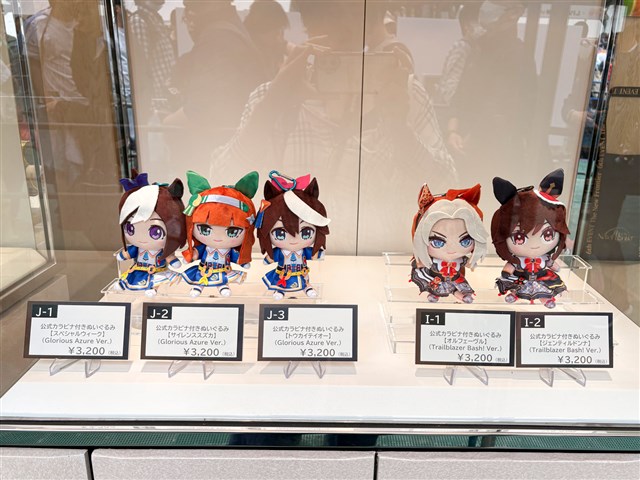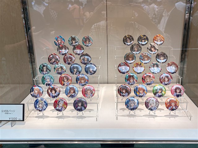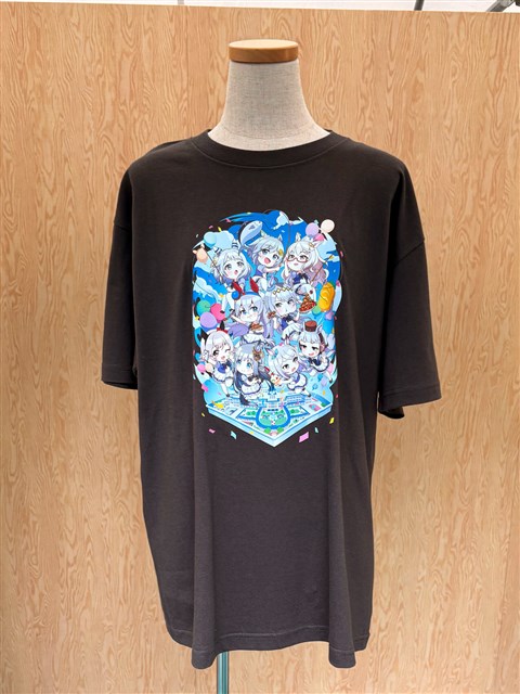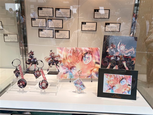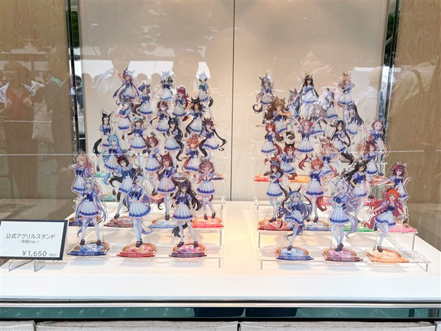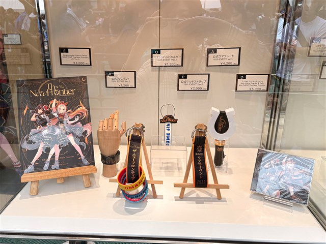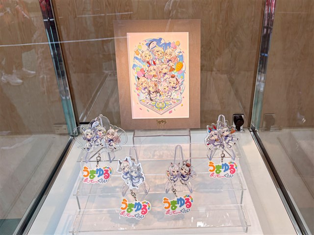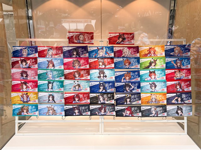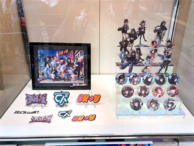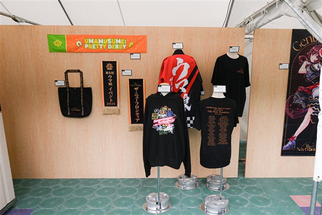 また、今回販売されているグッズの展示も行っており、パンフレットやアクリルスタンド、Tシャツやパーカーなどのオリジナルグッズを間近で見ることができる。販売している全種類が用意されているため、壁に並べられた『公式応援タオル』は非常に見応えのある展示となっていた。