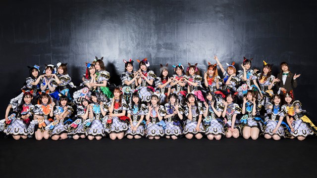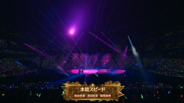 21曲目は福原さん、指出さん、夏目さんによる「本能スピード」。ウイニングライブさながらのレーザーの演出のなか、疾走感溢れる楽曲を披露する。3人がステージ上を駆け、一層会場を盛り上げる。