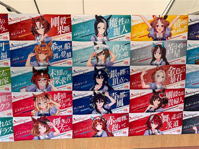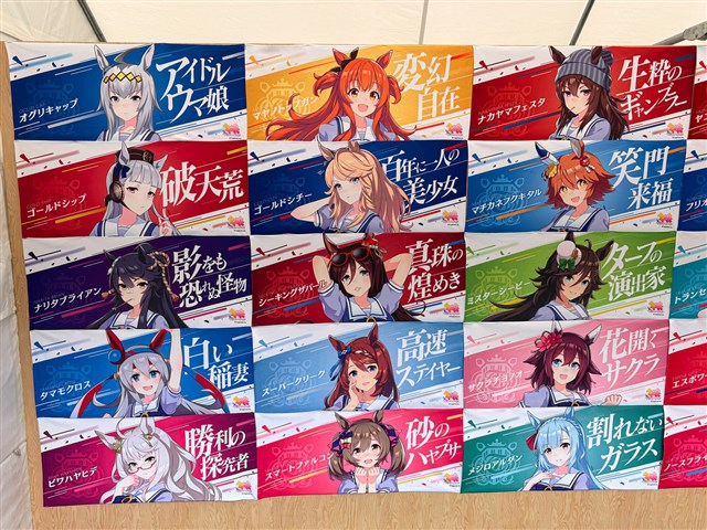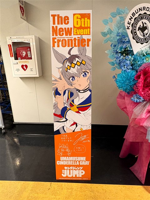 会場内に入ると、通路には企業や全国のトレーナーたちから贈られたフラワースタンドがずらりと並ぶ圧巻の光景が。イラストや手作りパペットなど凝った意匠のフラワースタンドの数々は、ウマ娘への愛で溢れていた。