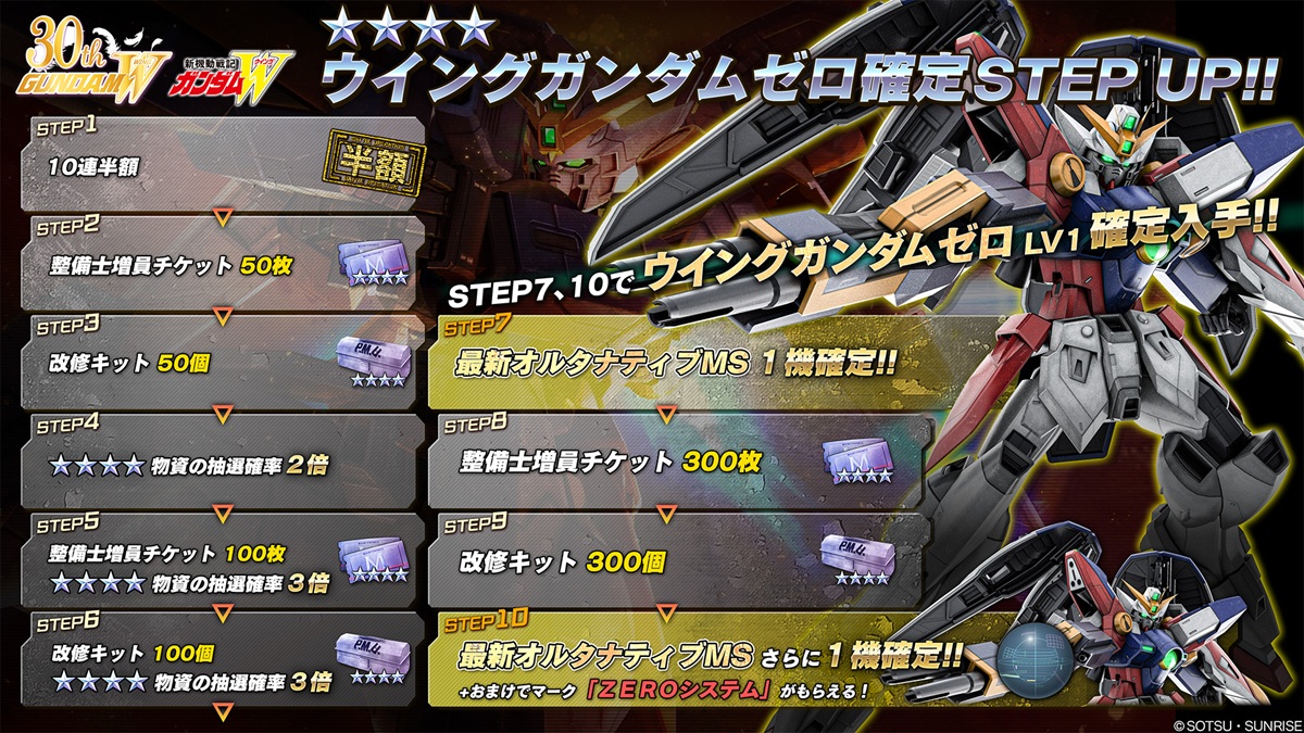 また、STEP7で「ウイングガンダムゼロ LV1」が確定で手に入り、STEP10でもう1機確定で入手可能な、「ウイングガンダムゼロ確定STEP UP抽選配給」も実施する。
