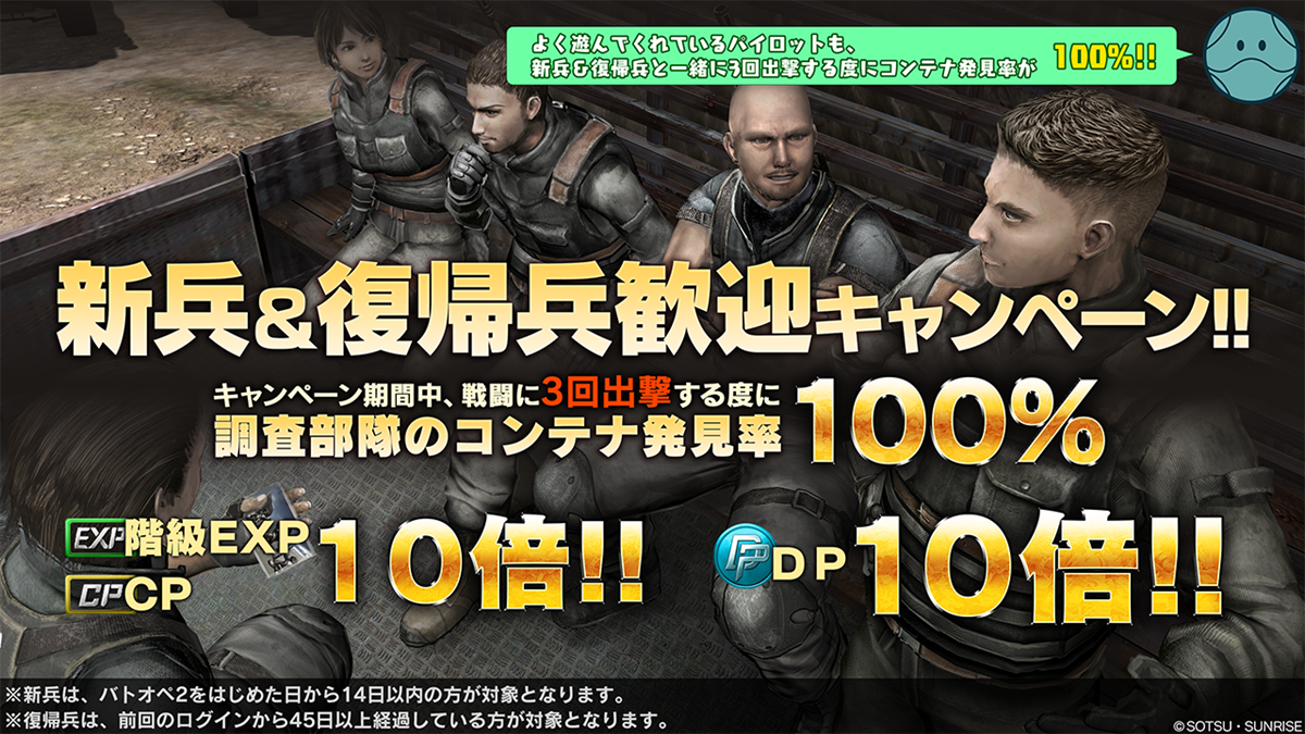 『バトオペ2』をはじめた日から14日以内の新兵&45日以上ログインしていなかった復帰兵限定で、期間中はすべての基本報酬(EXP、CP、DP)の取得量が10倍に上昇するキャンペーンを開催。