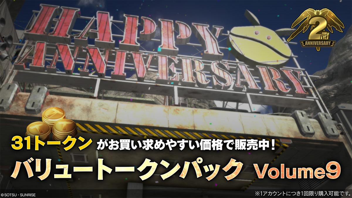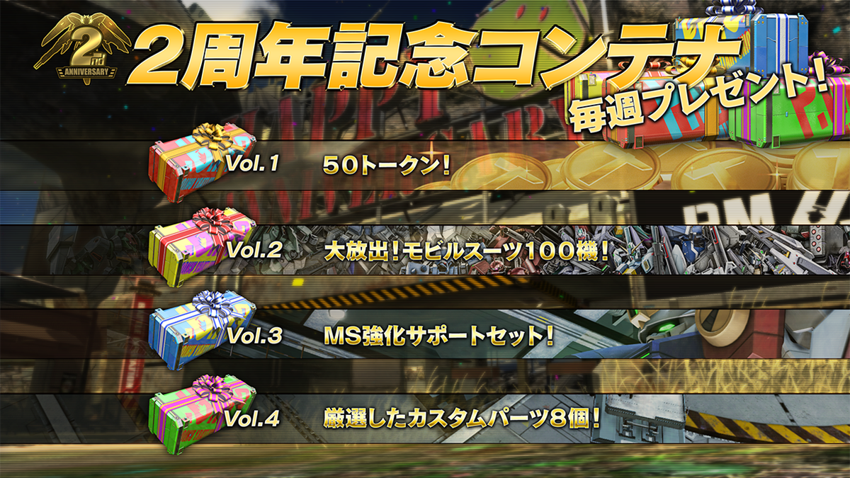 Steam®版2周年を記念して、期間中にログインすることで、全てのパイロットにトークンや、「νガンダム」や「サザビー」などのMS、強化アイテムセット、厳選したカスタムパーツなど、4週にわたりVol.1~Vol.4の記念コンテナが毎週にわたってプレゼント。