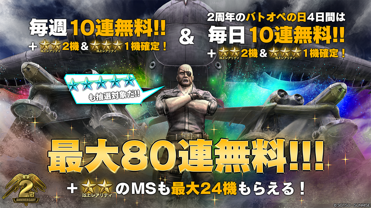 周年記念としてバトオペの日の4日間も毎日無料10連抽選配給となり、最大80連の無料抽選配給を要請できるチャンスとなる。