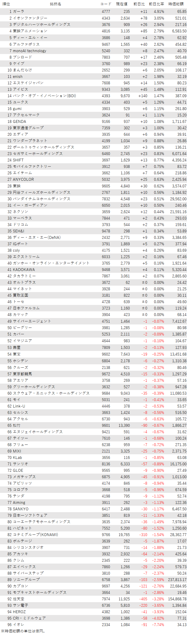 個別銘柄では、ガーラ<4777>やイオンファンタジー<4343>、デジタルハーツホールディングス<3676>、東映アニメーション<4816>が買われた一方、イオレ<2334>、CRI・ミドルウェア<3698>、HEROZ<4382>、サン電子<6736>が売られた。