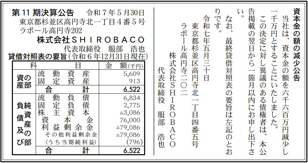 SHIROBACOが減資を行う。5月30日付の「官報」に掲載された「資本金の額の減少公告」によると、資本金を6600万円減らして1000万円にするとのこと。