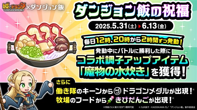 毎日12時・20時からの2回、2時間ずつ発動!「働き隊」のキーンから「ドラゴンメダル」が、「牧場」のフードから「きびだんご」が1回ずつ獲得できるようになる。さらに発動中に初めてバトルで勝利した際の1回だけ、コラボ調子UPアイテム「魔物の水炊き」が獲得できる。