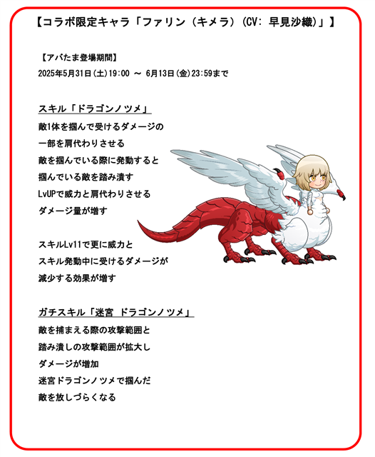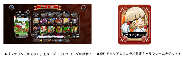 コラボ限定キャラ「ファリン(キメラ)」をリーダーにしてリーグに挑む「リーダー腕利きGP」を開催する。バトルに勝利してより多くの「キャラフレP」を獲得したランキング上位者や条件を達成した方には、コラボ限定「キャラフレーム」が贈られる。