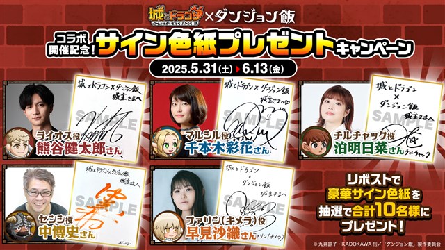 5月31日より、コラボ開催を記念した「コラボ開催記念!サイン色紙プレゼントキャンペーン」を実施する。『城とドラゴン』公式Xアカウント(@shirotodoragon)と『ダンジョン飯』アニメ公式アカウント(@dun_meshi_anime)をフォローし、対象ポストをリポストした方の中から抽選で10名に「豪華サイン色紙」をプレゼントする。