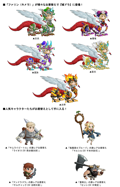 「ダン飯のアバたま」に限定キャラ「ファリン(キメラ)(CV:早見沙織)」が初登場し、初回当選でキャラタマゴとして入手できる。以降、当選回数に応じて「古兵」「魔竜」「星詠」「聖天」「炎帝」のお着替えなどが手に入る。また城ドラキャラのコラボ限定激レアお着替えとして、サムライビートルの「ライオス(CV:熊谷健太郎)」、竜魔導士ブルードの「マルシル(CV:千本木彩花)」、マンドラゴラの「チルチャック(CV:泊明日菜)」、重剣士の「センシ(CV:中博史)」がボイス付きで登場。アバたまを割って、コラボ期間中にしか手に入らない限定キャラタマゴやアイテムを手に入れよう!