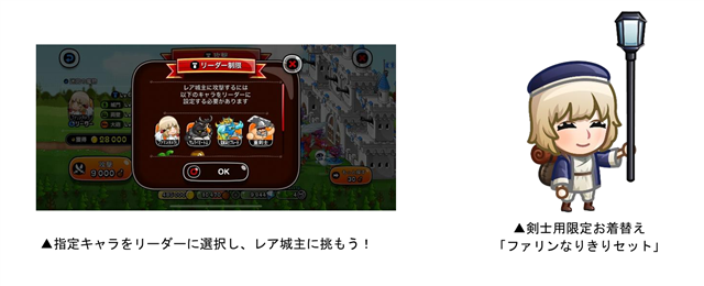 「バトル」から「ひとりで」または「みんなで」を選び、「攻撃」を選択すると、ランダムでレア城主が出現する「レア城主イベント」を開催する。条件をクリアすると剣士用限定お着替え「ファリンなりきりセット」がもらえる。