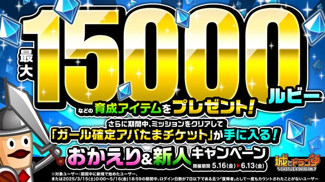 《復帰者》『城ドラ』のアカウントは保有していたが、2025年3月15日(土)0:00 ~ 5月16日(金)18:59までの間、ログイン日数が7日以下である且つ「復帰者」として一度もカウントされたことがないユーザー