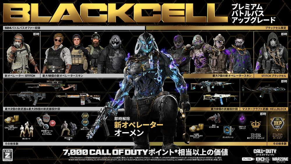 本シーズンではオーメンを筆頭に、冥界をモチーフにしたオペレータースキンや武器設計図など、新たなコンテンツが登場する。ブラックセルを購入すると、シーズン04のバトルパスで利用可能なすべての報酬を入手できるようになる。