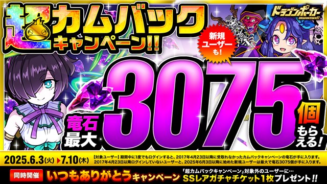 2017年4月23日以降に実施されたカムバックキャンペーンにて、ログインせずに受取れなかった竜石がまとめて手に入る。2017年4月23日以降のカムバックキャンペーン期間中、ログインしていないユーザーに、最大で竜石3075個をプレゼント!さらに、2025年6月3日以降にドラゴンポーカーを始めたユーザーにも竜石3075個プレゼント!これを機会に、ドラゴンポーカーにログインして大量の竜石をGETしよう!また、いつも『ドラゴンポーカー』をプレイして頂いているユーザーの皆様には「SSレアガチャチケット1枚」プレゼントする。