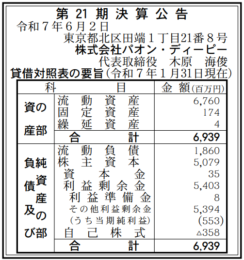 パオン・ディーピーの2025年1月期(第21期)の決算は、最終利益が前の期比123.8%増の5億5300万円と大幅増益を達成した。前の期(2024年1月期)の実績は、最終利益2億4700万円だった。6月2日付の『官報』に掲載された「決算公告」で判明した。
