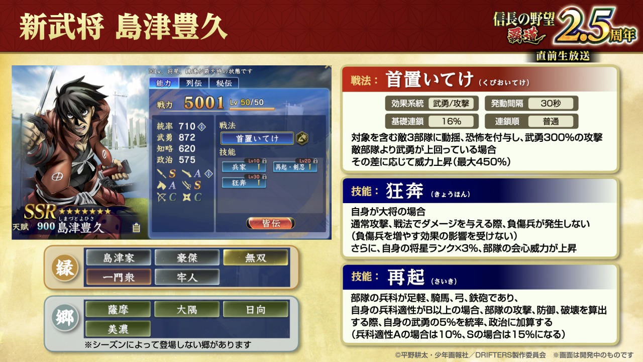 さらに、2.5周年とアニメ『DRIFTERS』とのコラボを記念して、6月1日から6月15日23:59まで1600名に豪華賞品が当たる「2.5周年コラボ記念還元キャンペーン」を開催中。本キャンペーンについては、6月1日から開始する『信長の野望 覇道』ゲーム内のイベント「特別鍛冶工房・DRIFTERS」で、ミッションを50回達成することで参加が可能。