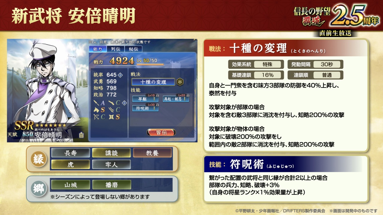 今回のイベントでは、アニメ『DRIFTERS』でおなじみの「島津豊久(しまづとよひさ)」「那須与一(なすのよいち)」「安倍晴明(あべのはるあきら)」が登場する限定ガチャ「限定登用・DRIFTERS」のほか、領主フレームや領主アイコン、チャットスタンプなどのコラボ限定品が手に入るコラボ記念ログインボーナスが開催中。