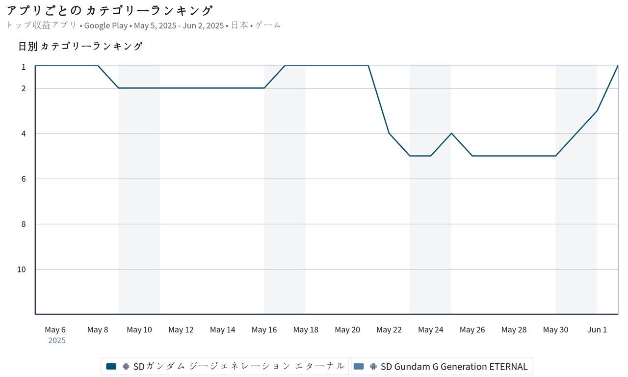 | 1 | ↑2 | SDガンダム ジージェネレーション エターナル | バンダイナムコエンターテインメント<7832>/アプリボット<4751> |