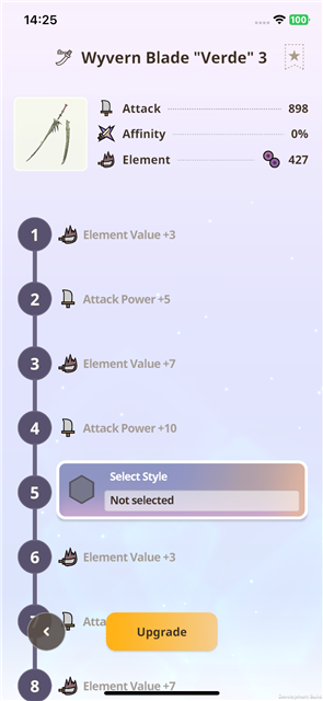 ▲スタイル強化を行うにはモンスター素材が必要になる。レベル5で「スタイルの選択」が可能となり、この際には次元変異モンスターからドロップする専用素材と、既存★9、10モンスターからドロップする専用素材が必要になる。また、強化を進めるといくつかのステータスの中から伸ばしたいものを自分で選択できる特殊なマスもある。