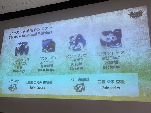 次に、シーズン6より追加される4種のモンスター「ナルガクルガ」「ドスフロギィ」「ビシュテンゴ」「ブラントドス」を紹介。また、7月には古龍種、8月には亜種のモンスターが追加されることも明かされた。