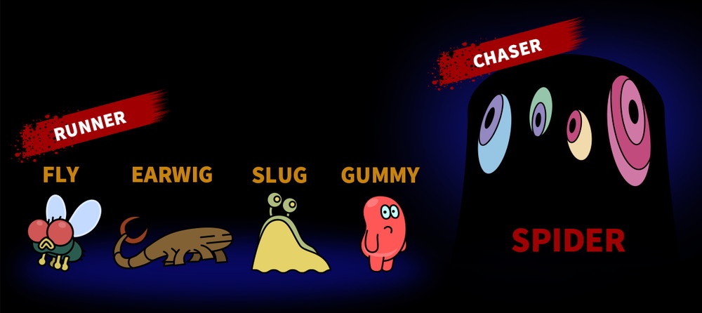 本作は、古びたホテルを舞台に、追跡者のスパイダーと逃走者の4匹の虫たちが駆け引きを繰り広げるオンライン鬼ごっこゲーム。逃走者は協力して生き残りをかけて戦い、スパイダーは闇に潜みながら、糸を飛ばして虫たちを捕獲する。