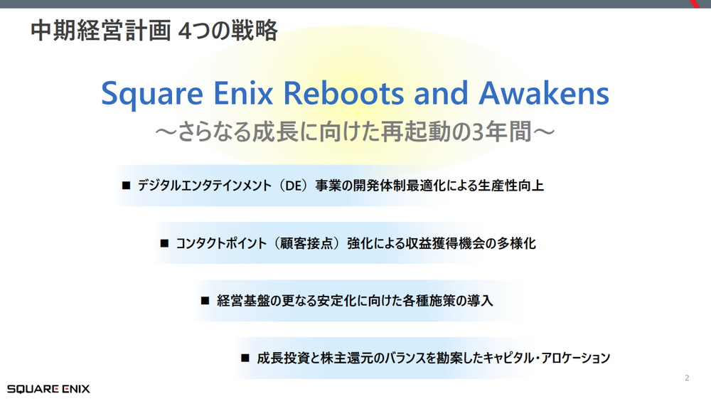 同社は、2024年5月に新中期経営計画(25年3月期~27年3月期)として、「Square Enix Reboots and Awakens~さらなる成長に向けた再起動の3年間~」を発表した。確かな面白さをもつバラエティ豊かなコンテンツを世界中に届ける存在に進化するため、新中期経営計画の3か年を「さらなる成長に向けた再起動の3年間」と位置づけて、以下の4つの戦略を実行する、としている。