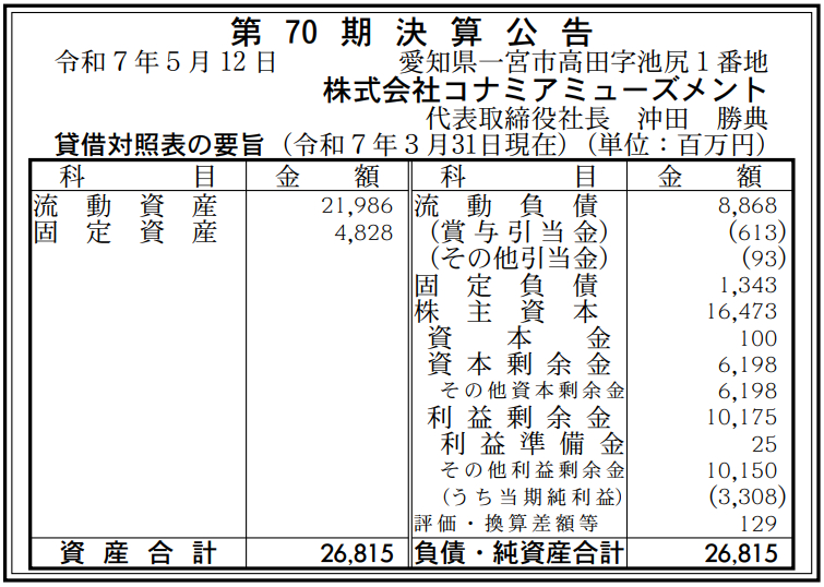 コナミアミューズメントの2025年3月期(第70期)の決算は、最終利益が前の期比3.1%増の33億0800万円と増益を達成した。前の期(2024年3月期)の実績は、最終利益32億0800万円だった。6月5日付の『官報』に掲載された「決算公告」で判明した。