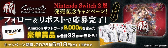 Nintendo Switch 2 版『祇(くにつがみ):Path of the Goddess』の発売と、エクストラコンテンツ「畏界遷宮」の配信を記念して、抽選で合計33名様に豪華賞品が当たるキャンペーンを開催する。