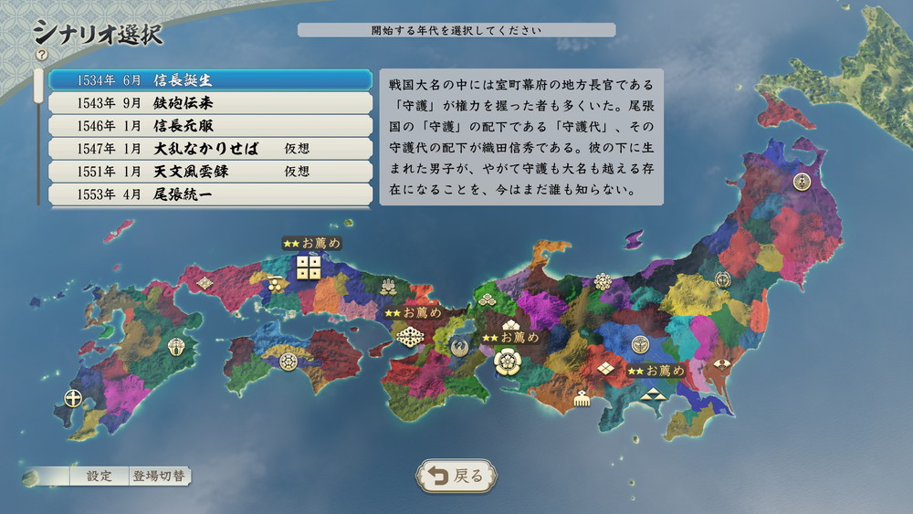 本作では、信長の父・織田信秀や謀聖・尼子経久などが活躍する史実シナリオ「信長誕生」に加え、明智光秀が織田信長を討った「本能寺の変」直後から開始する史実シナリオ「天王山」、もし応仁の乱が起きずに時代が進んでいたら…、そんな状態の1547年1月から始まる仮想シナリオ「大乱なかかりせば」など、史実と仮想をふくめ新たに6本のシナリオを追加。より多様な状況の戦国乱世を体験することができる。