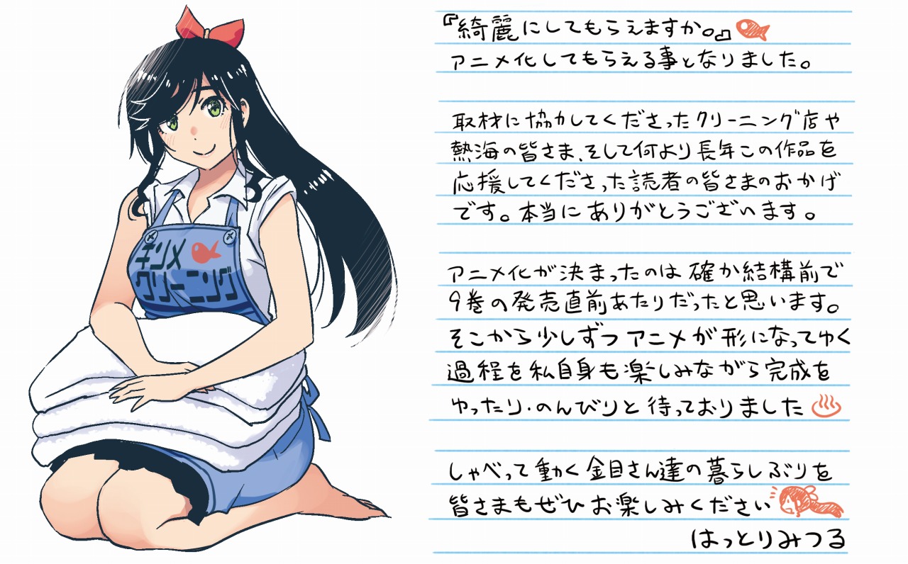 本作の主人公・金目綿花奈が、自らが営むクリーニング店「キンメクリーニング」で働く姿を描いたアニメティザービジュアルも公開。 さらに、原作者・はっとりみつる先生から届いたアニメ化お祝いコメントも公開された。