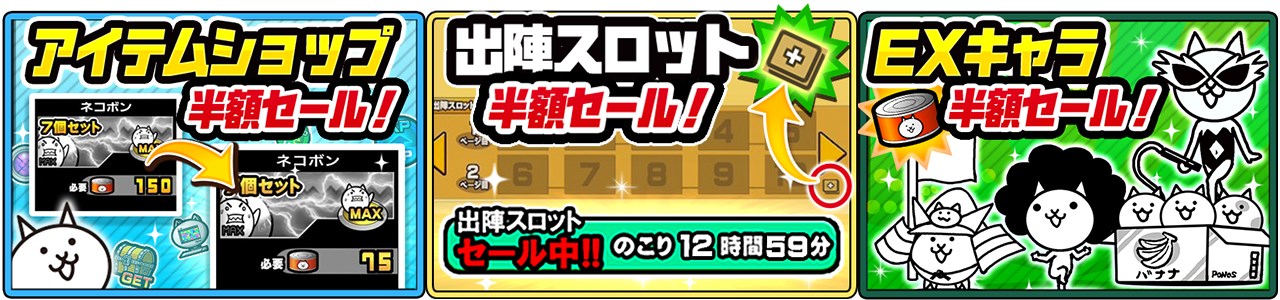 にゃんこ大戦争をお得に遊べる大チャンス。アイテムショップ、出陣スロット、EXキャラ購入に必要なネコカンが半額になるセールを開催する。