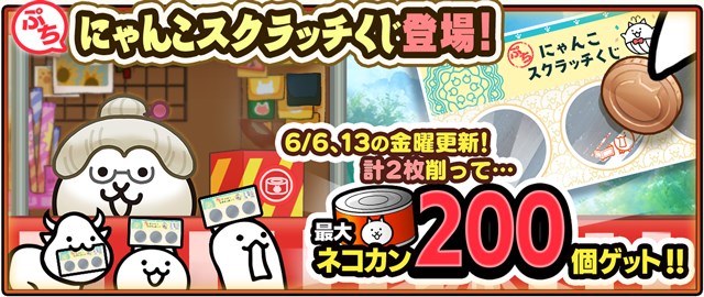 毎週ネコカンが当たる「ぷちにゃんこスクラッチくじ」が登場する。 スクラッチを削ってネコカンを手に入れよう!