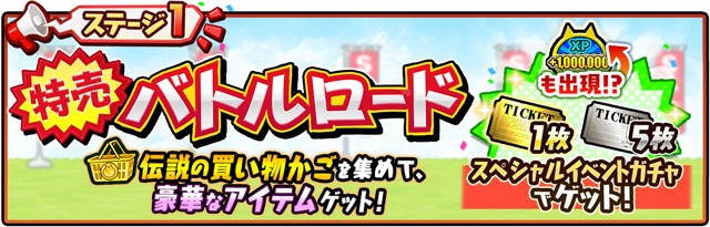 期間中、2種類の限定ステージを開催する。「特売バトルロード」では、期間限定の「プレミアムフェア」スペシャルイベントガチャを回せる「伝説の買い物かご」が手に入る。「伝説の買い物かご」を集めて豪華アイテムをゲットしよう!