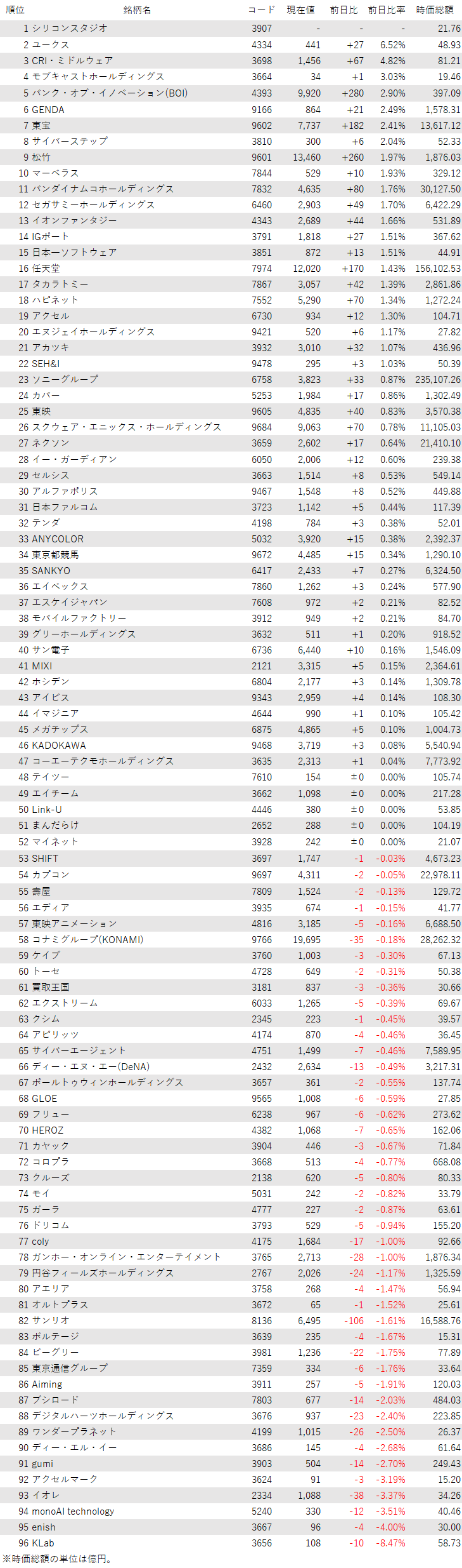 こうしたなか、ゲーム・エンタメ関連企業をみると、登録されている96銘柄のうち、上昇は46銘柄(48%)、下落は44銘柄(46%)、変わらずは6銘柄(6%)で、上昇した銘柄のほうが多かった。