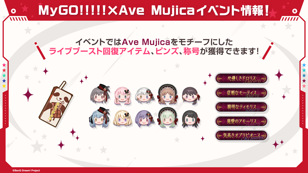 今回のイベントでは、イベント報酬としてAve Mujicaをモチーフとしたライブブースト回復アイテムやピンズ、称号などが登場。