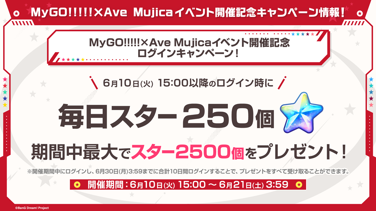 6月10日(火)15時以降にログインすることで、毎日「スター250個」が手に入り、10日間で最大「スター2500個」をプレゼント。
