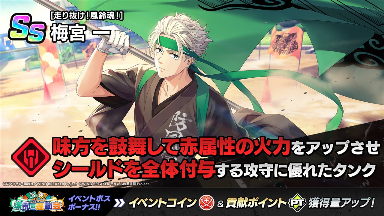 期間限定イベント「激突!風鈴VS獅子頭連!波乱の運動会」の開始と同時にイベントに登場する応援団の衣装を身に纏った「梅宮 一」の出現率がUPしたピックアップガチャを開催する。「[走り抜け!風鈴魂!]梅宮 一」はバフの数によってチームを鼓舞する正統派シールドタンクとなっている。また、この衣装でしか見ることのできない特別な交流も用意している。