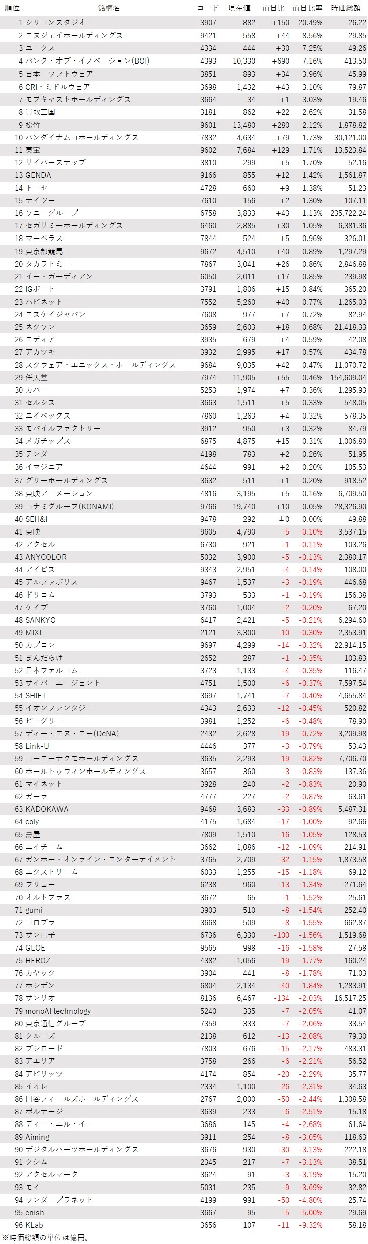 そうした中でゲーム・エンタメ関連株の動きを見てみると、下記の表に登録しているゲーム・エンタメ関連企業96銘柄のうち、上昇は39銘柄(41%)、下落は56銘柄(58%)、変わらずは1銘柄(1%)で、下落した銘柄の方が多かった。