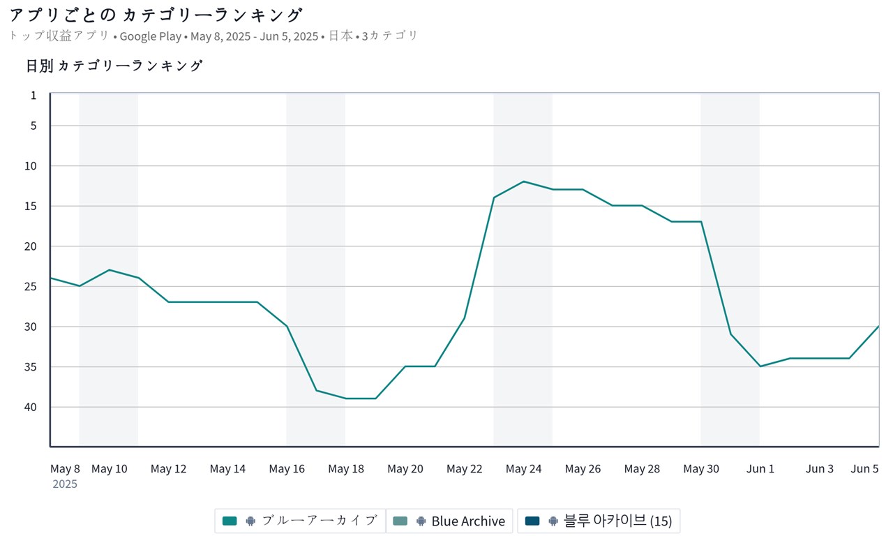 | 30 | ↑4 | ブルーアーカイブ -Blue Archive- | Yostar |