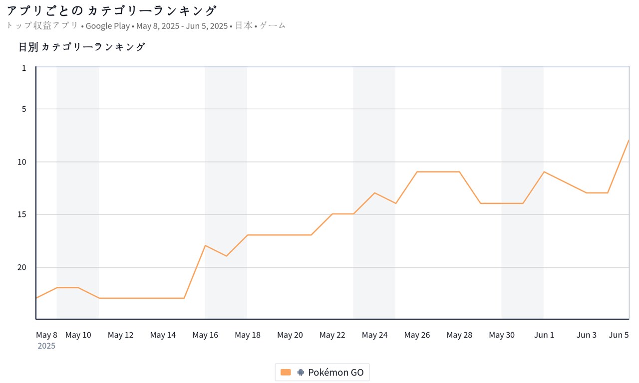 トップ10圏内では、Nianticとポケモンの『ポケモンGO』が前日の13位から8位に上昇してきた。『ポケモンGO』は、世界規模で開催されるイベント「Pokémon GO Fest 2025」を順次開催中で、ゲーム内が大いに活性化する形になっているようだ。
