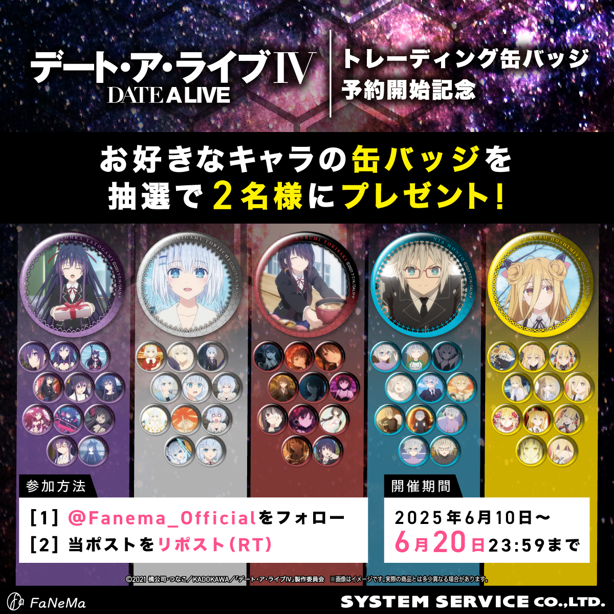 システムサービスは、アニメ・マンガ・ゲーム作品等のキャラクター商品の企画・製作・販売をする自社ECサイト「FaNeMa」(https://fanema.jp/ )にて、アニメ『デート・ア・ライブⅣ』より「トレーディング缶バッジ」第2弾を発売。さらに、新商品発売を記念したX(旧Twitter)フォロー&リポストキャンペーンも実施する。