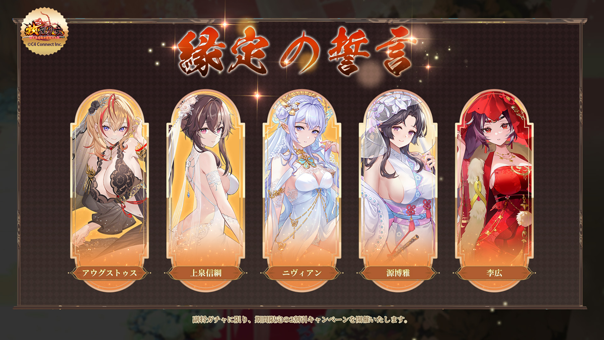 開催期間中、アウグストゥス、上泉信綱、ニヴィアン、源博雅、李広がウェディングドレスと共に登場、一緒に戦おう!