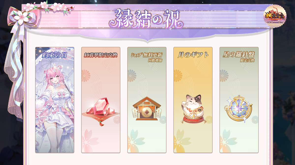 『約束の日』『紅翡翠限定交換』『ショップ無料更新回数増加』『月のギフト』『星の羅針盤限定交換』など、盛りだくさんのイベントを用意している。