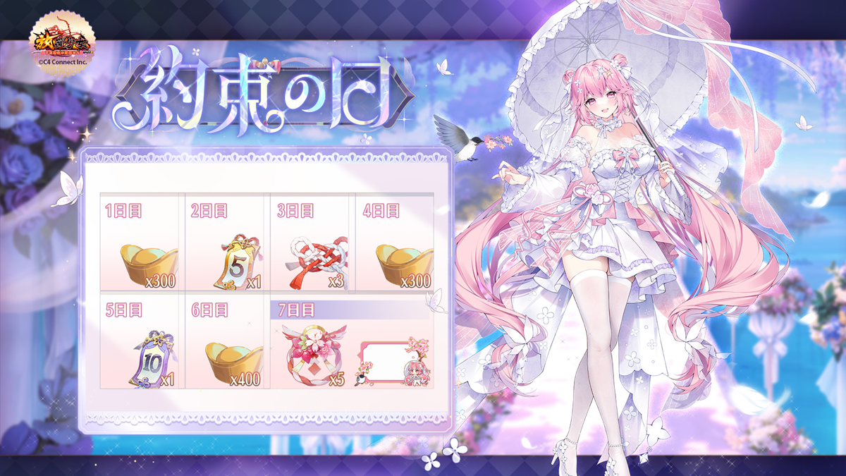 開催期間中、ゲームにログインすると元宝や高速戦闘券、絆の水引、限定バブルなどの報酬を獲得できる。