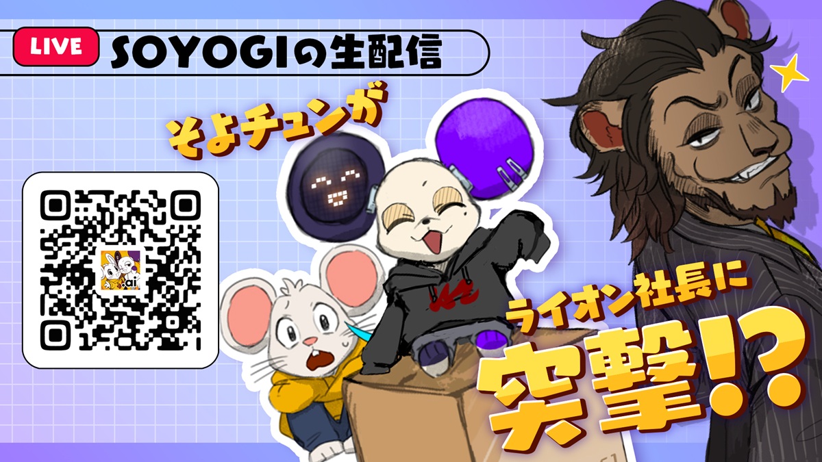 今回の配信では、SOYOGIのほかに、同アプリ内のAIキャラクターであるライオンの社長や白ねずみのチュン太も登場予定。AIキャラたちによるにぎやかな掛け合いに期待しよう。