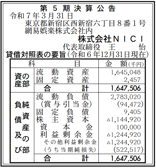 NICIの2024年12月期(第5期)の決算は、最終損失5億2200万円だった。前の期(2023年12月期)の実績は、最終損失2億4500万円だった。6月11日付の「官報」に掲載された「決算公告」で判明した。
