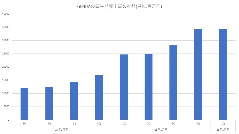 GENDA<9166>は、6月11日、2026年1月期 第1四半期の連結決算を発表し、売上高342億6900万円(前年同期比38.8%増)、営業利益13億9000万円(同32.4%減)、経常利益10億7300万円(同46.7%減)、最終利益2億2300万円(同81.7%減)だった。