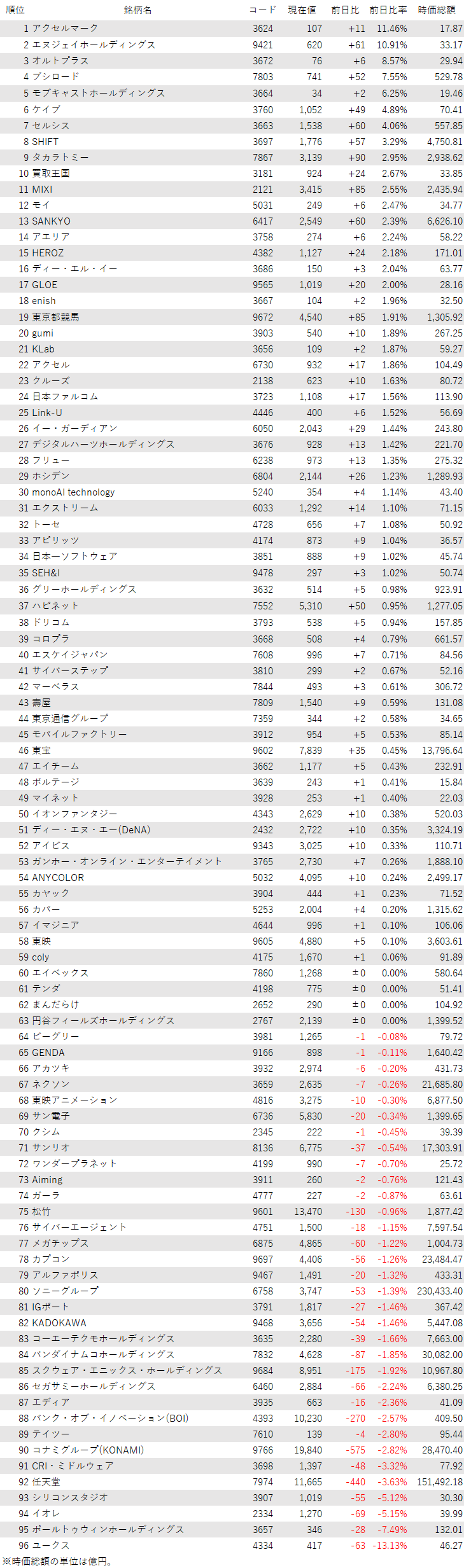 こうしたなか、ゲーム・エンタメ関連企業をみると、登録されている96銘柄のうち、上昇は59銘柄(61%)、下落は33銘柄(34%)、変わらずは4銘柄(4%)で、上昇した銘柄のほうが多かった。