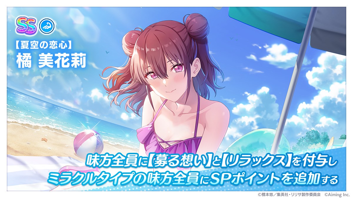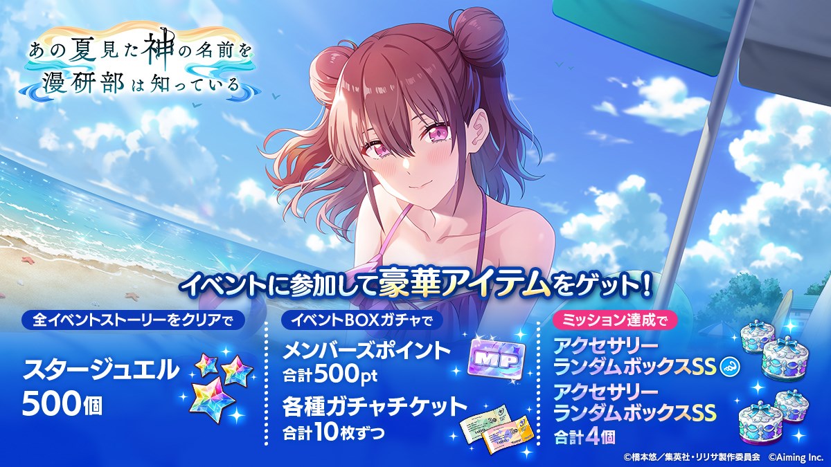 オリジナルストーリーイベント「あの夏見た神の名前を漫研部は知っている」の開催と同時に、【夏空の恋心】橘 美花莉をピックアップしたイベント限定プレミアムガチャを開催する。【夏空の恋心】橘 美花莉は、所持しているだけでイベント「あの夏見た神の名前を漫研部は知っている」でのイベントコイン獲得量が増加する。水着姿の美花莉を手に入れて、イベントを楽しもう。