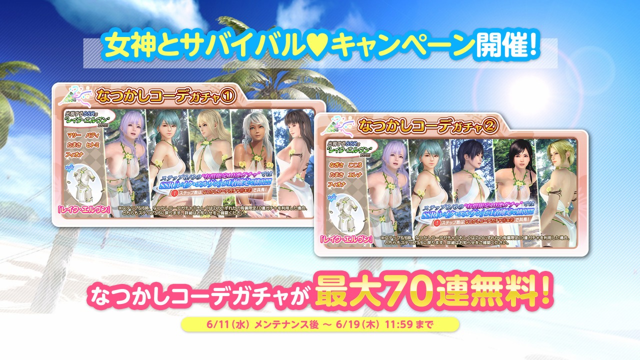 また、期間限定の「女神とサバイバル♥キャンペーン」が開始。6月19日まで、過去に登場したSSR水着「レイク・エルヴン」が再登場する、なつかしコーデガチャを最大70連無料で楽しむことができる豪華ログインボーナスを開催。期間中にログインすると、1日1回(最大7日間)、なつかしコーデガチャ専用の10連ガチャチケットが手に入る。