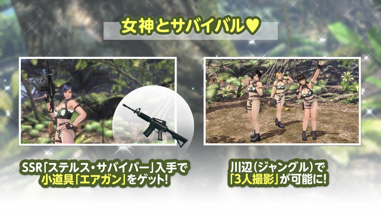 新SSR水着「ステルス・サバイバー」は、迷彩模様のデザインがカッコよさを引き立てつつ、濡れ透けも楽しめるセクシーな水着となっている。そのほか、「ステルス・サバイバー」の入手を条件としたミッションをクリアすると、『小道具「エアガン」片手で持つ』を手に入れることができる。